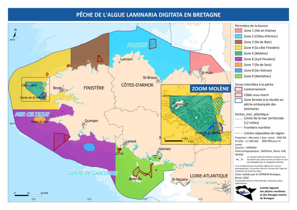 | Critères d’éligibilité de la licence | Bateau ≤ 12 m Bateau équipé d’un VMS obligatoire Licence: Etre éligible à l’obtention d’un extrait Laminaria digitata zone et au moins un extrait Laminaria digitata – grue Avoir un navire ayant une capacité de charge Laminaria digitata inférieure ou égale à 60 tonnes |